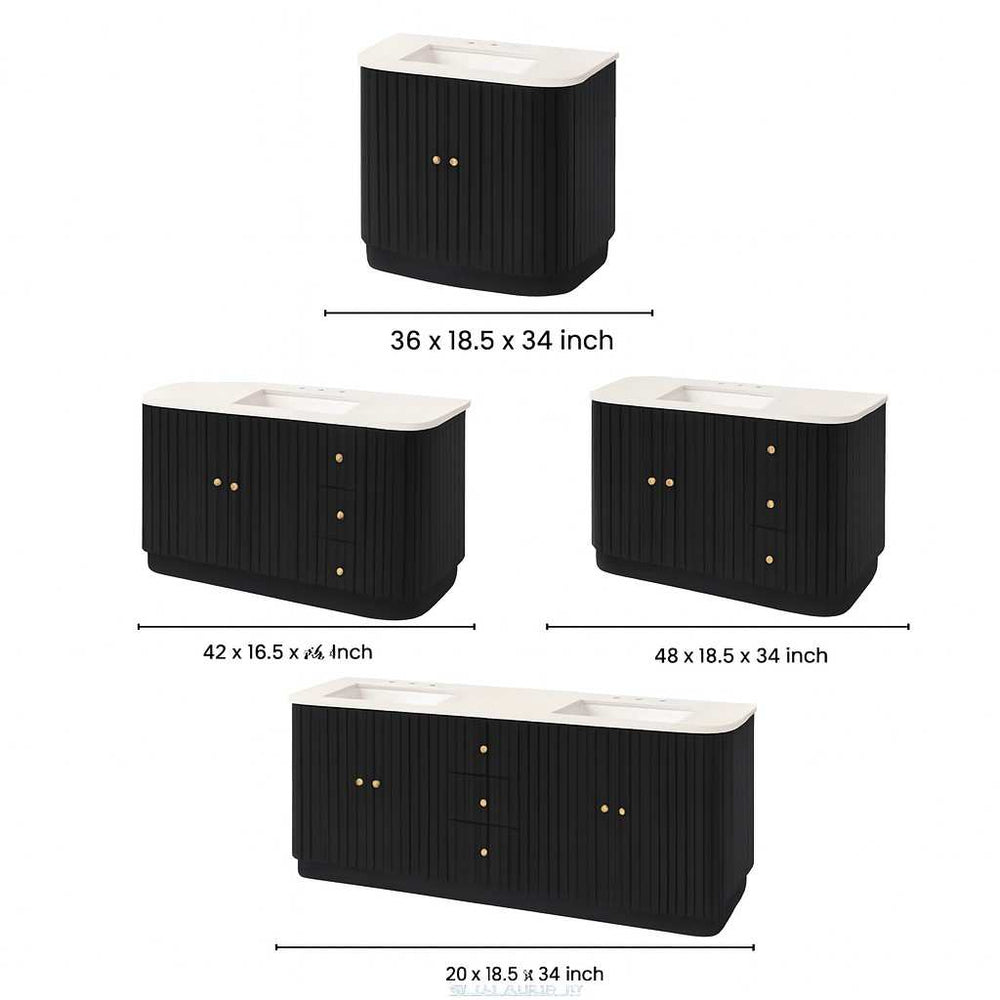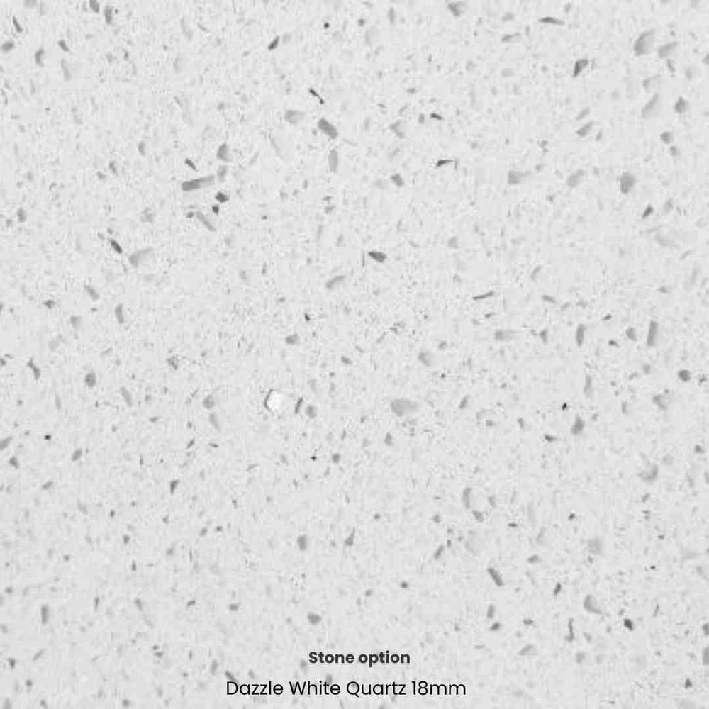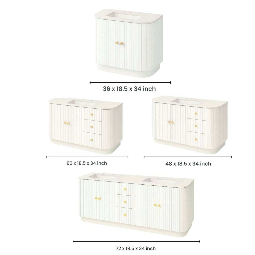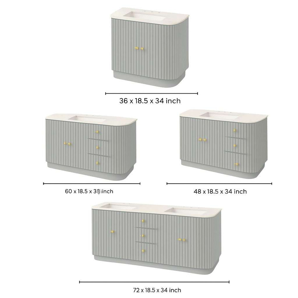 Dimensions (L x D x H): Varies by size Cabinet Material: MDF Veneer, Pine Wood, Plywood Countertop Options: Dazzle White Quartz 18mm or Cultured Marble 18mm Sink: Ceramic, Square Shape Hardware: Soft Closing Doors/Drawers Design: Fluted Design with Toe Kick